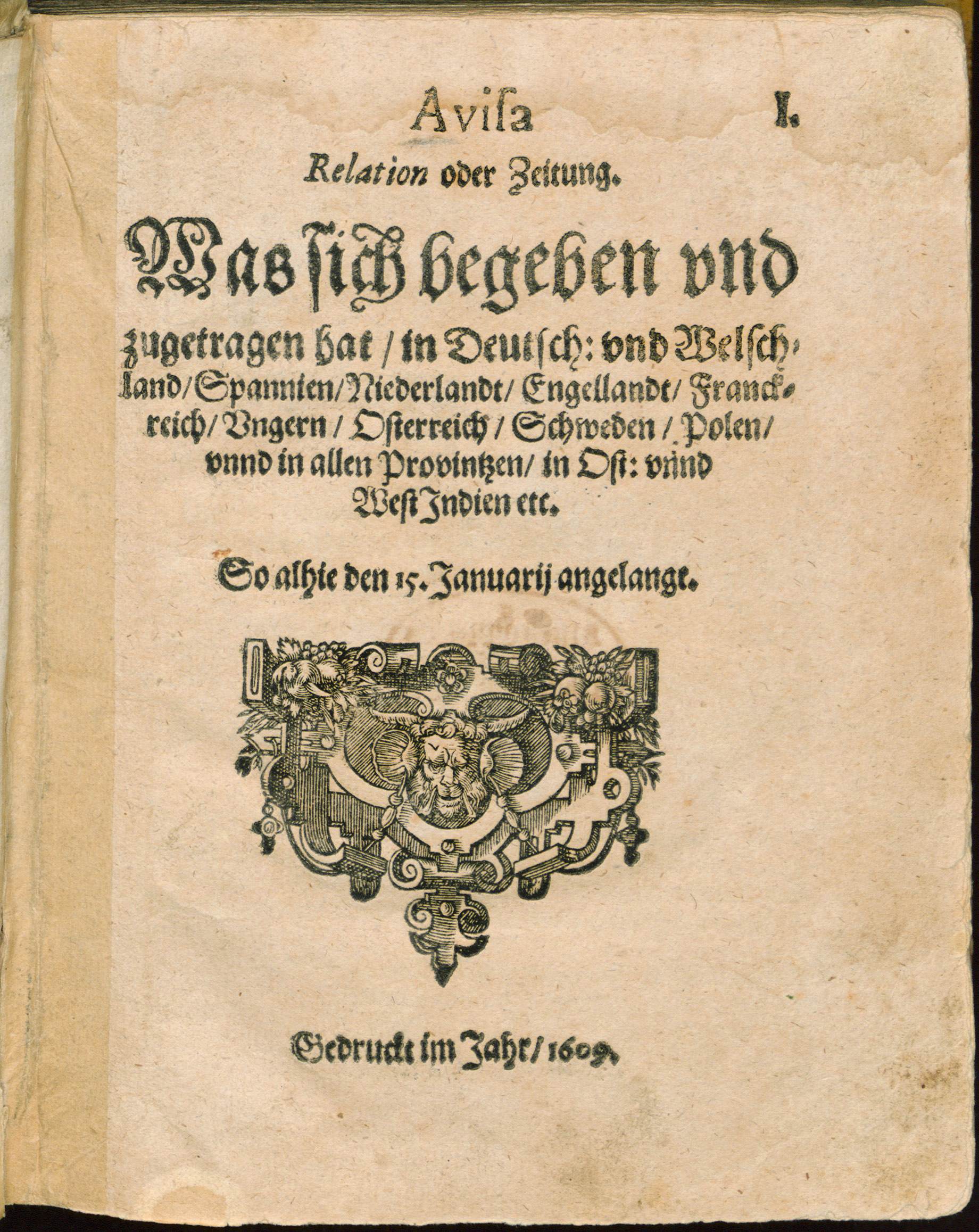 Abb.: Titelblatt der Ausgabe vom 15. Januar 1609 des Aviso – eine der beiden nach heutigem Forschungsstand ältesten deutschen periodischen (Wochen-) Zeitungen. Hier das Exemplar aus der Gottfried-Wilhelm-Leibniz-Bibliothek. Quelle: Wikimedia Commons. Public Domain.