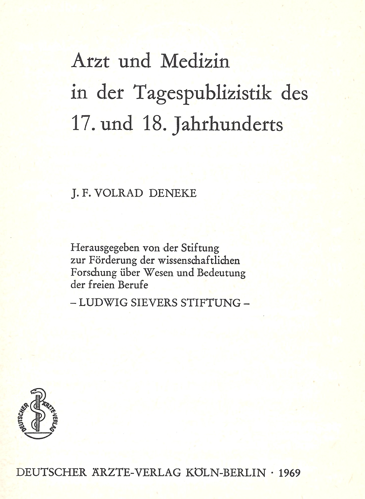 Abb.: Deneke 1969 ist eine der wichtigsten Sekundärquellen zur Geschichte der Medizin- bzw. Gesundheitskommunikation in Printmedien. Er hat eine beeindruckende Menge an Primärquellen gesichtet und ausgewertet. Seine Untersuchung steht noch in der Tradition der älteren deutschen Publizistik- und Zeitungswissenschaft mit ihrer historischen und deskriptiv-interpretierenden Methodik. Deneke enthält aber auch einige statistisch-quantifizierende Aussagen, die für die neuere Kommunikationswissenschaft typisch sind. Quelle: Deneke 1969, Innentitel.