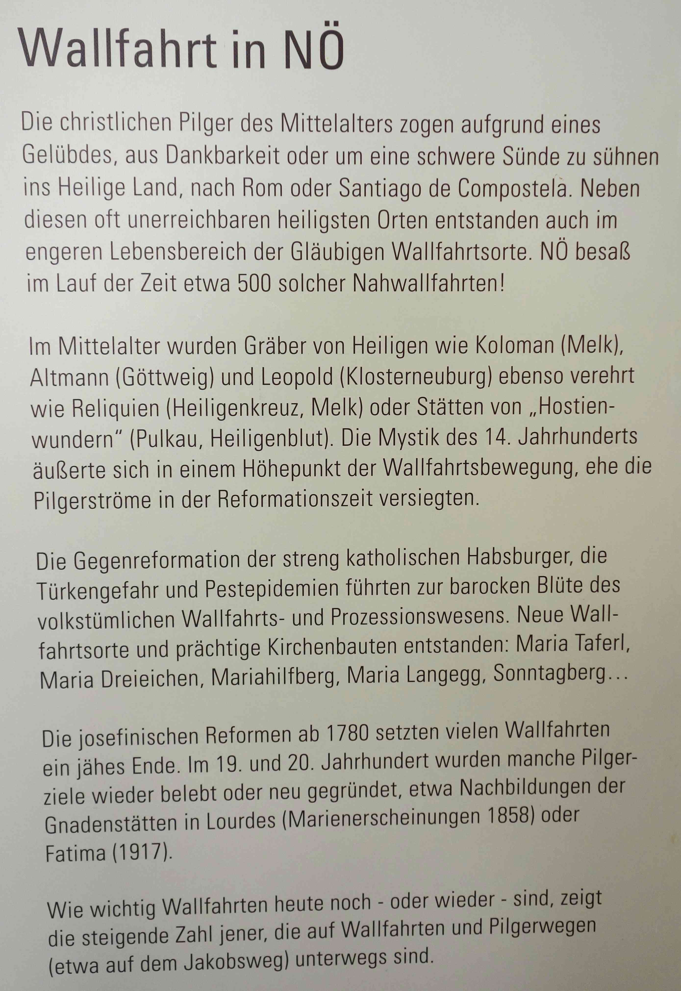 Abb.: Zur Geschichte von Wallfahrten speziell in Niederösterreich (NÖ). Quelle: Schautafel des Wallfahrtsmuseums in Maria Langegg (Stand 2025). Foto: Tobias Liebert. Zum Vergrößern bitte anklicken.
