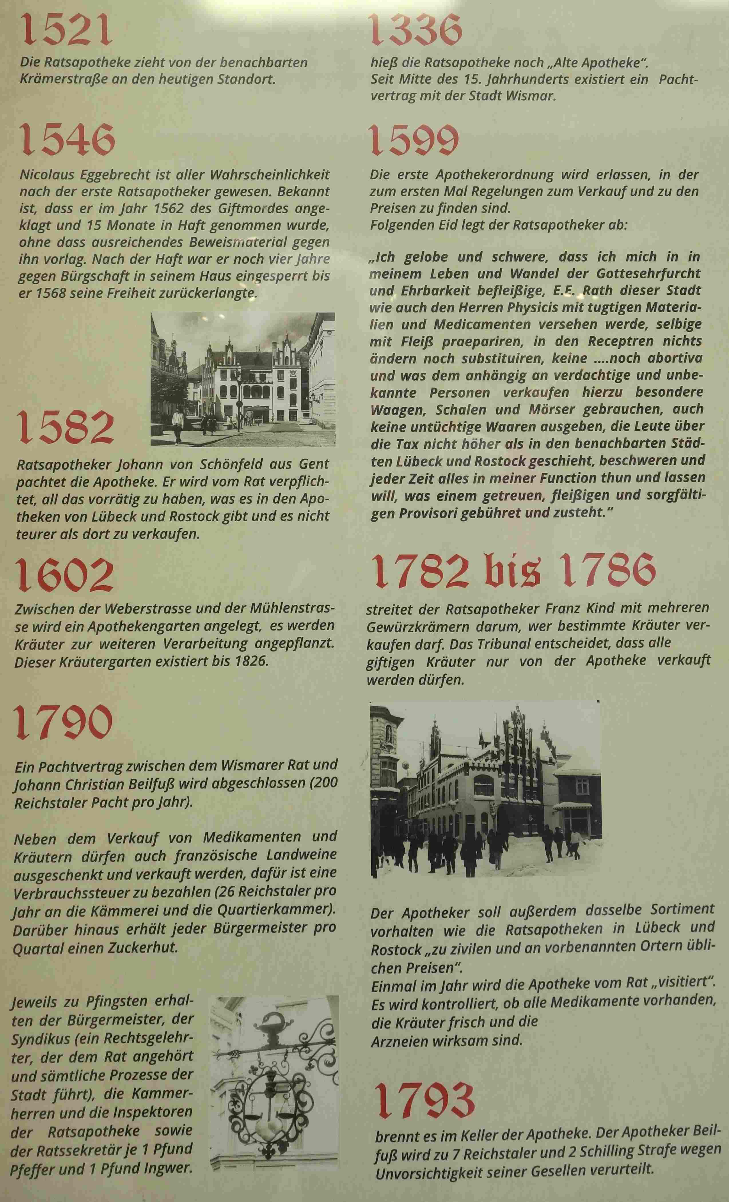 Abb.: Wichtige Ereignisse aus der Geschichte der Ratsapotheke Wismar vom 14. Jhdt. (rechts oben) bis zum 18. Jhdt. (rechts unten). Ein Pachtvertrag mit dem Rat existierte erst seit Mitte des 15. Jhdts. (siehe rechts oben), ein so genannter „Ratsapotheker“ wohl erst seit 1546 und eine „erste“ Apothekerordnung seit 1599, so dass der faktische Einflus des „Rates“ der Stadt und damit der Obrigkeit vorher eher gering gewesen sein dürfte. Quelle: Öffentliche Schautafel zur Geschichte der Ratsapotheke Wismar. Foto: Tobias Liebert (2025).