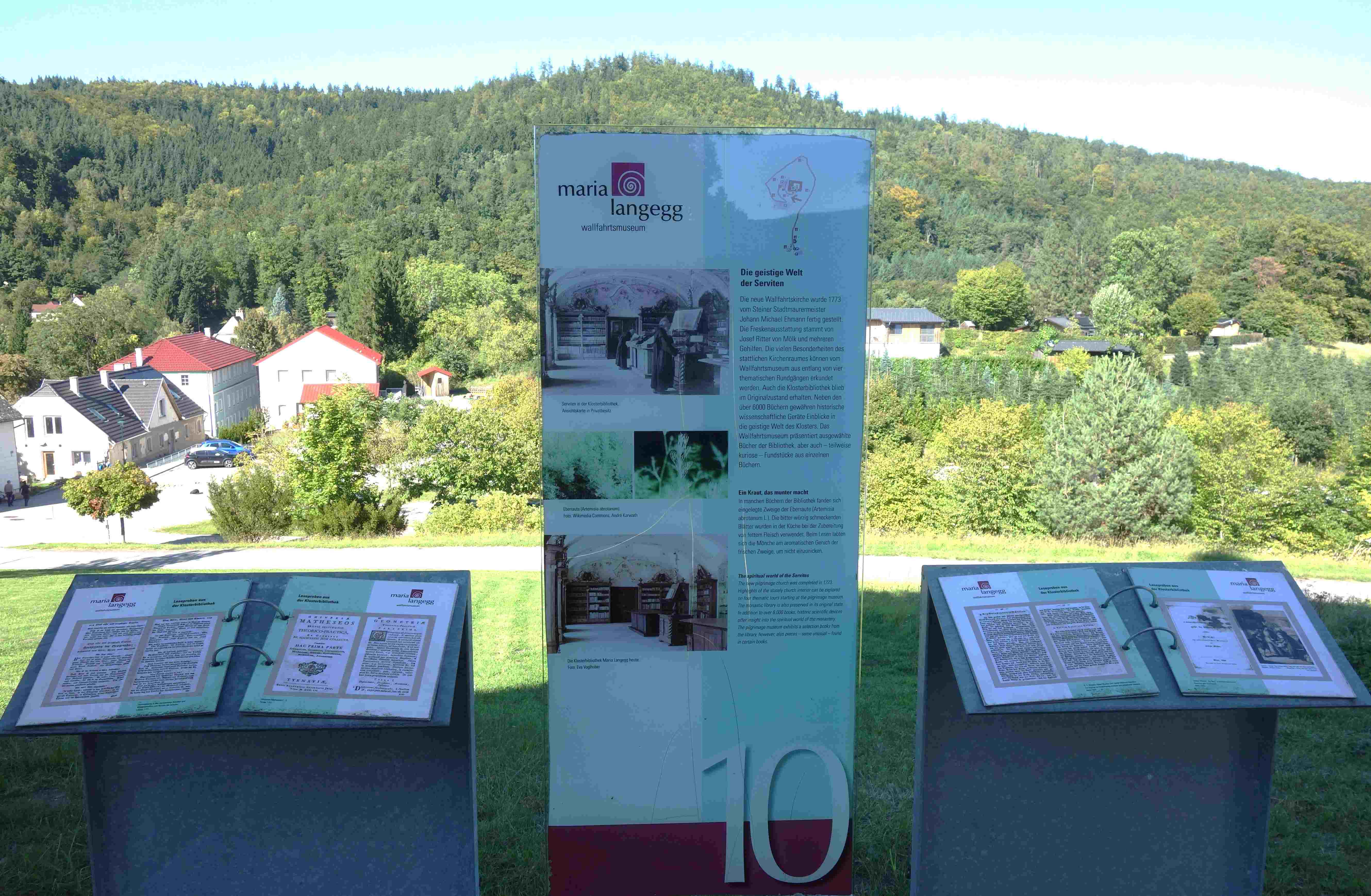Abb.: Blick vom Kirchen- und Klosterplateau Maria Langegg auf das beschauliche Dörfchen und die waldreiche Umgebung, im Vordergrund Schautafeln des Wallfahrtsmuseums (Stand 2025). Foto: Tobias Liebert. Zum Vergrößern bitte anklicken.