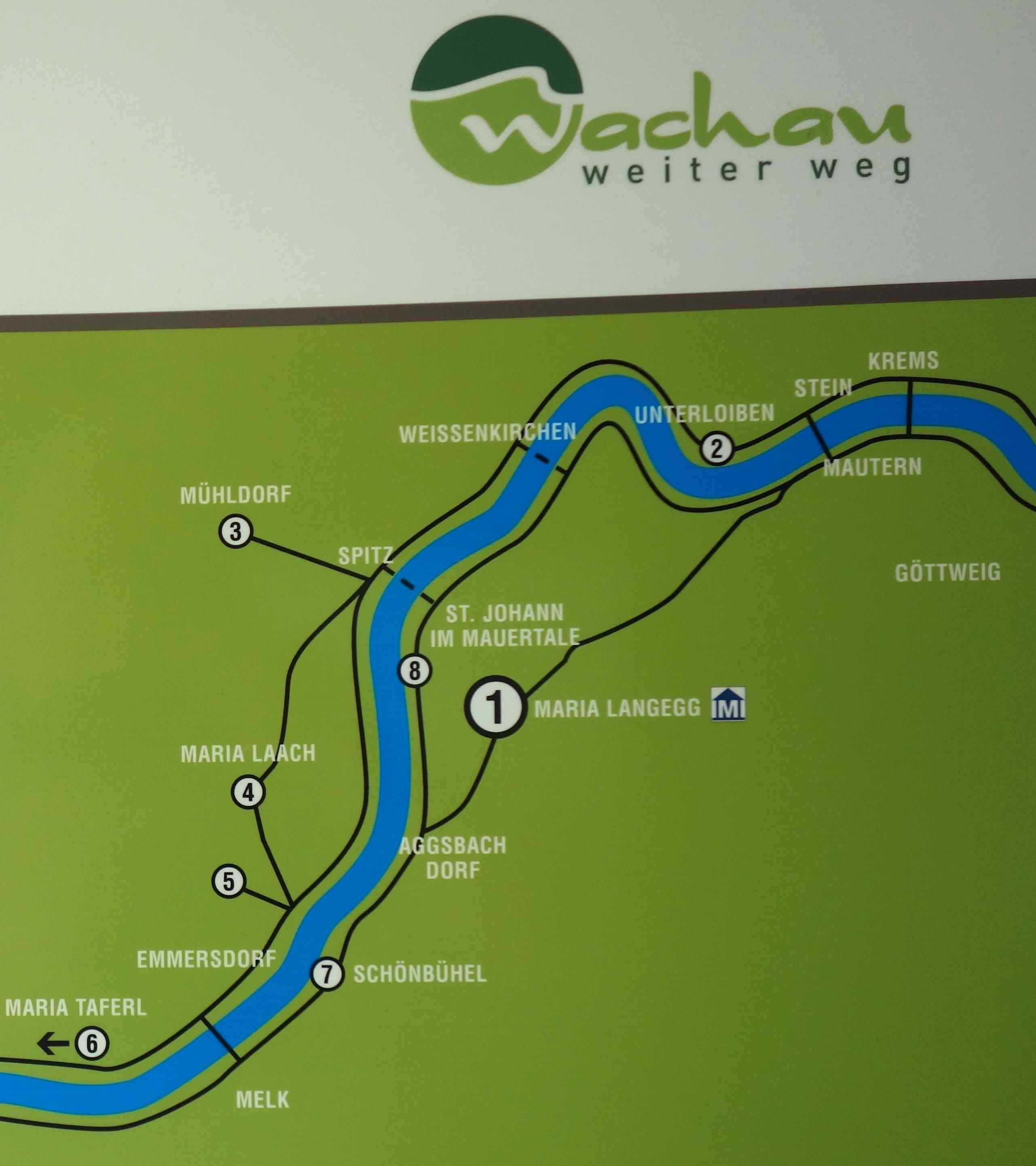 Abb.: „Wachauer Pilgerwege“: Pilgerziele und -wege in der Wachau links und rechts der Donau. Quelle: Schautafel am Wallfahrtsmuseum Maria Langegg (Stand 2025). Foto: Tobias Liebert