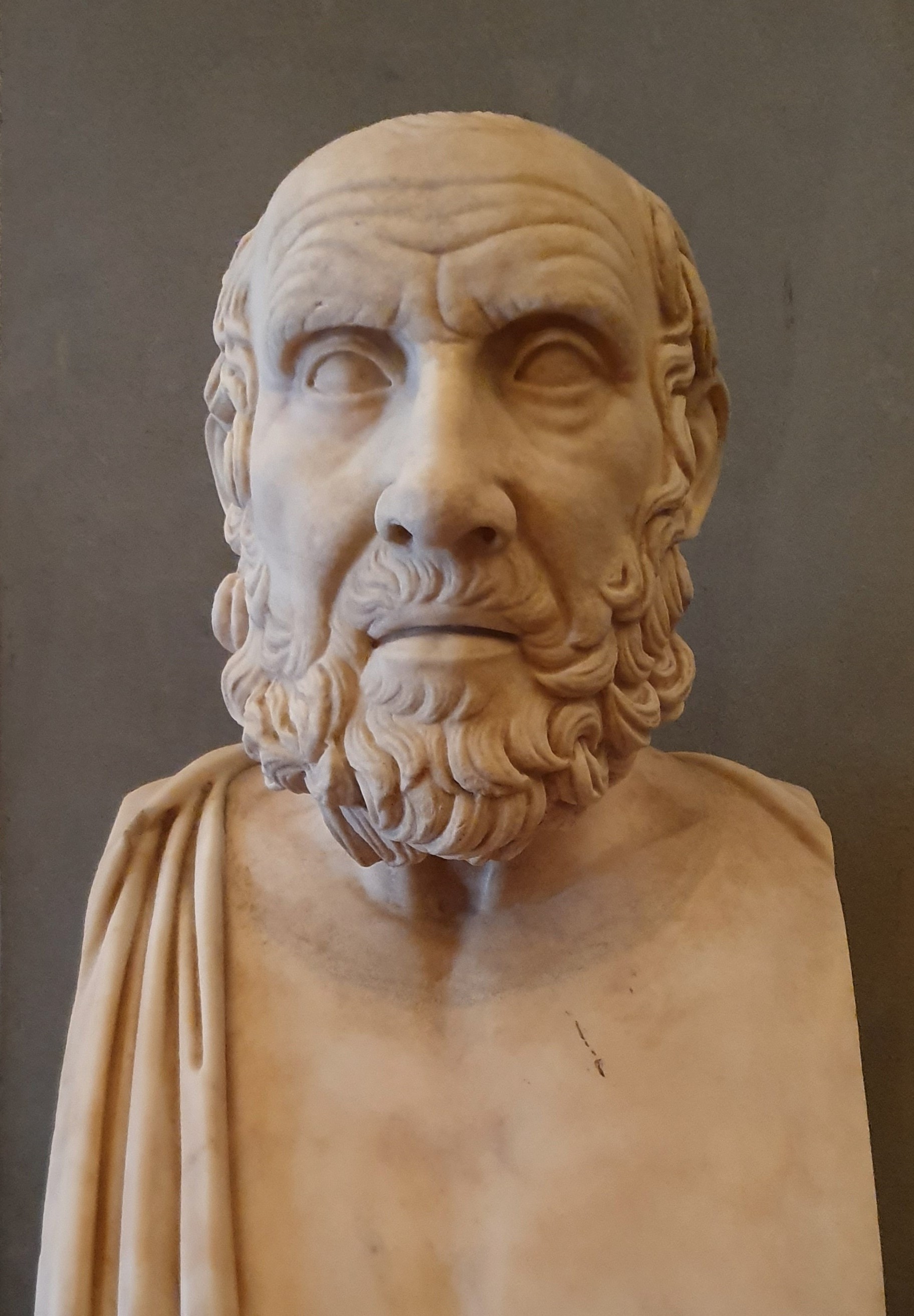 Abb.: Statue des Kopfes von Hippokrates von Kos, angefertigt im 1. Jhdt. unserer Zeitrechnung. Aufbereitet von Yair Haklai auf Basis der Datei „Herm with the head of Hippocrates-Uffizi.jpg“ .Quelle: Wikimedia Commons. Creative Commons Attribution-Share Alike 4.0 International license.