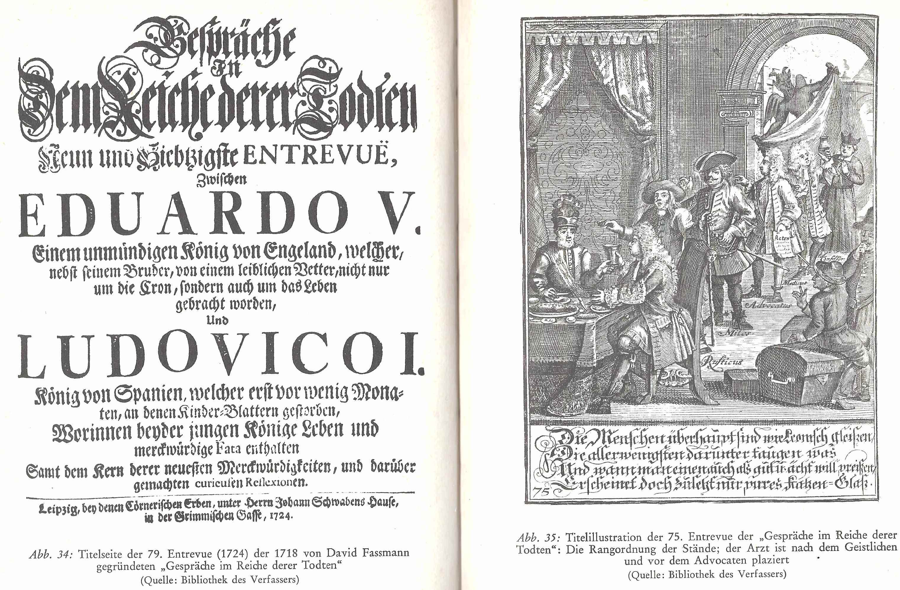 Aus der Programmatik der Moralischen Wochenschriften ergibt sich, dass darin auch gesundheitsbezogene Aussagen einschließlich solcher zum Stand der Ärzte enthalten sein mussten. Die große Abbildung zeigt an einem Beispiel, wie in der Schrift „Gespräche in dem Reiche derer Todten“ die Stellung der Ärzteschaft bildlich dargestellt wurde. Das Periodikum war eine Moralische Wochenschrift, die zwischen 1718 und 1739 von David Faßmann in Leipzig herausgegeben wurde.