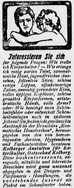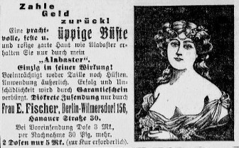 Die Abbildungen zeigen einige Beispiele, wie von der Anzeigenwerbung das Themenfeld rund um „Körperkultur“, Schlankheit und Schönheit aufgegriffen wurde. Das rechte Anzeigenbeispiel aus dem Jahr 1909 ist ein überwiegendes Textinserat mit Eye-Catcher („Hingucker“) und einer modern anmutenden Argumentation für das Lesen einer Broschüre, die am – wie man heute sagen würde – Point of Sale abgeholt werden muss.