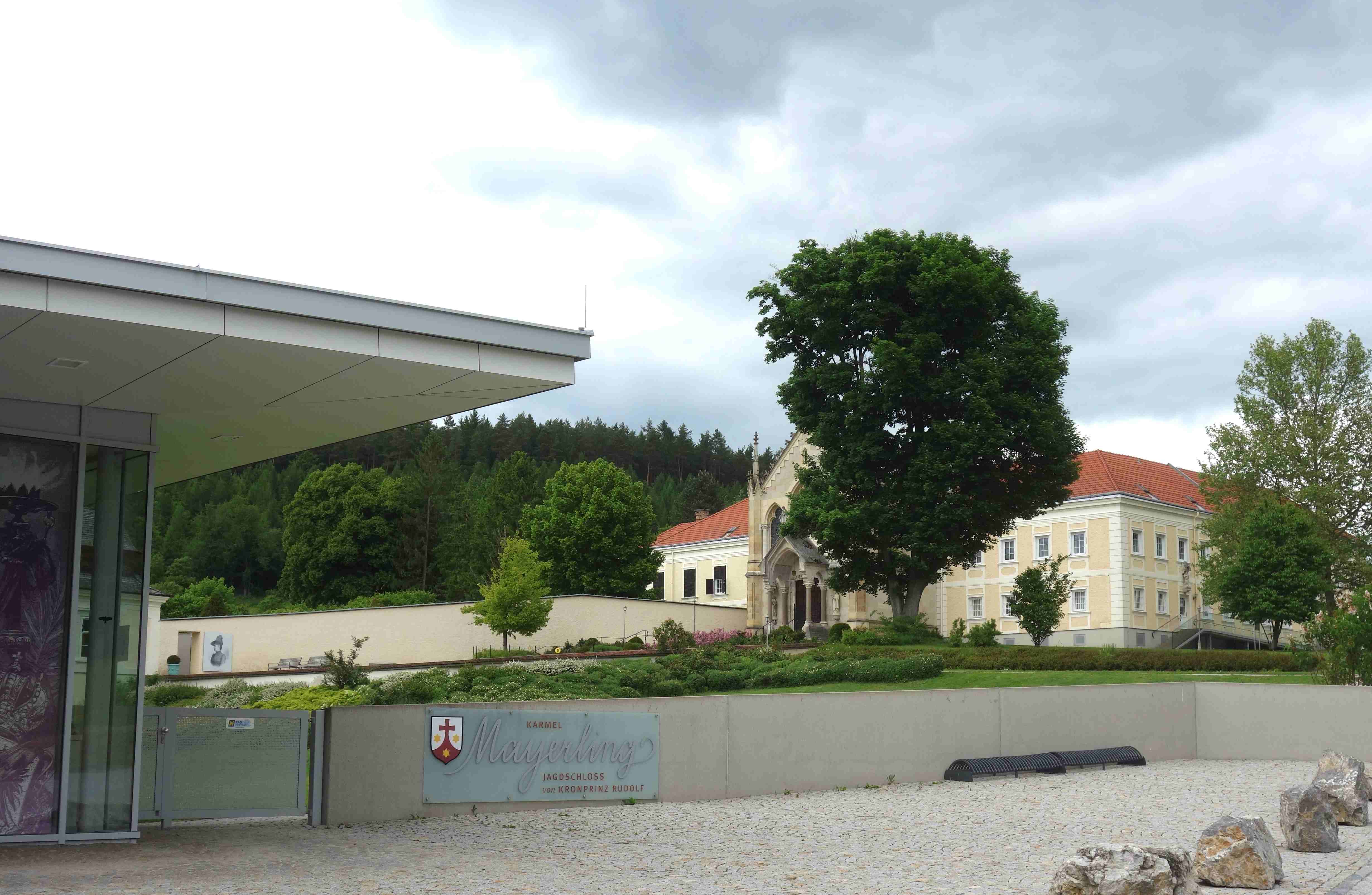 Abb.: Besucherzentrum (links) und ehem. Jagdschloss / heute Museum (rechts) in Mayerling (2025). Foto: Tobias Liebert.