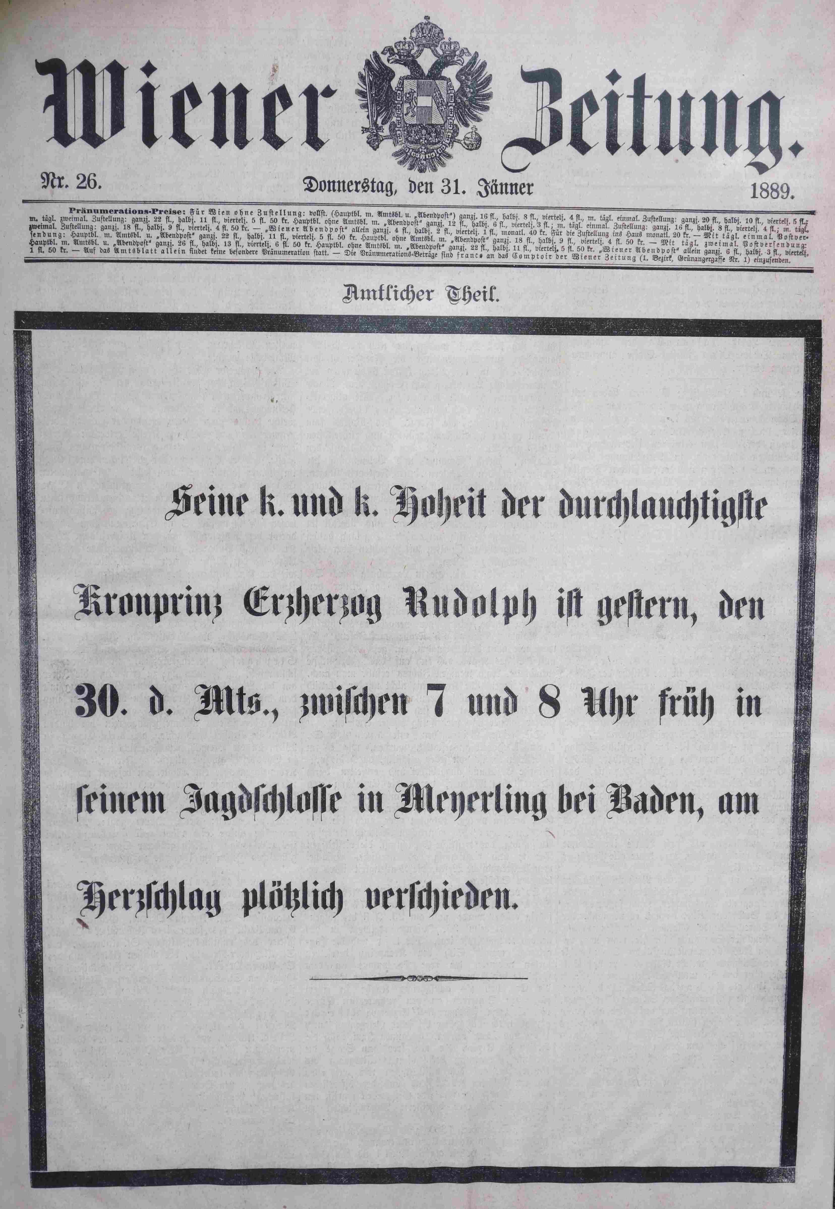 Abb.: Titelseite der Wiener Zeitung vom 31. Januar 1889 mit der Bekanntmachung von Rudolfs Tod als „Herzschlag“. Quelle: Schautafel am Besucherzentrum Mayerling (Stand 2025). Foto: Tobias Liebert.
