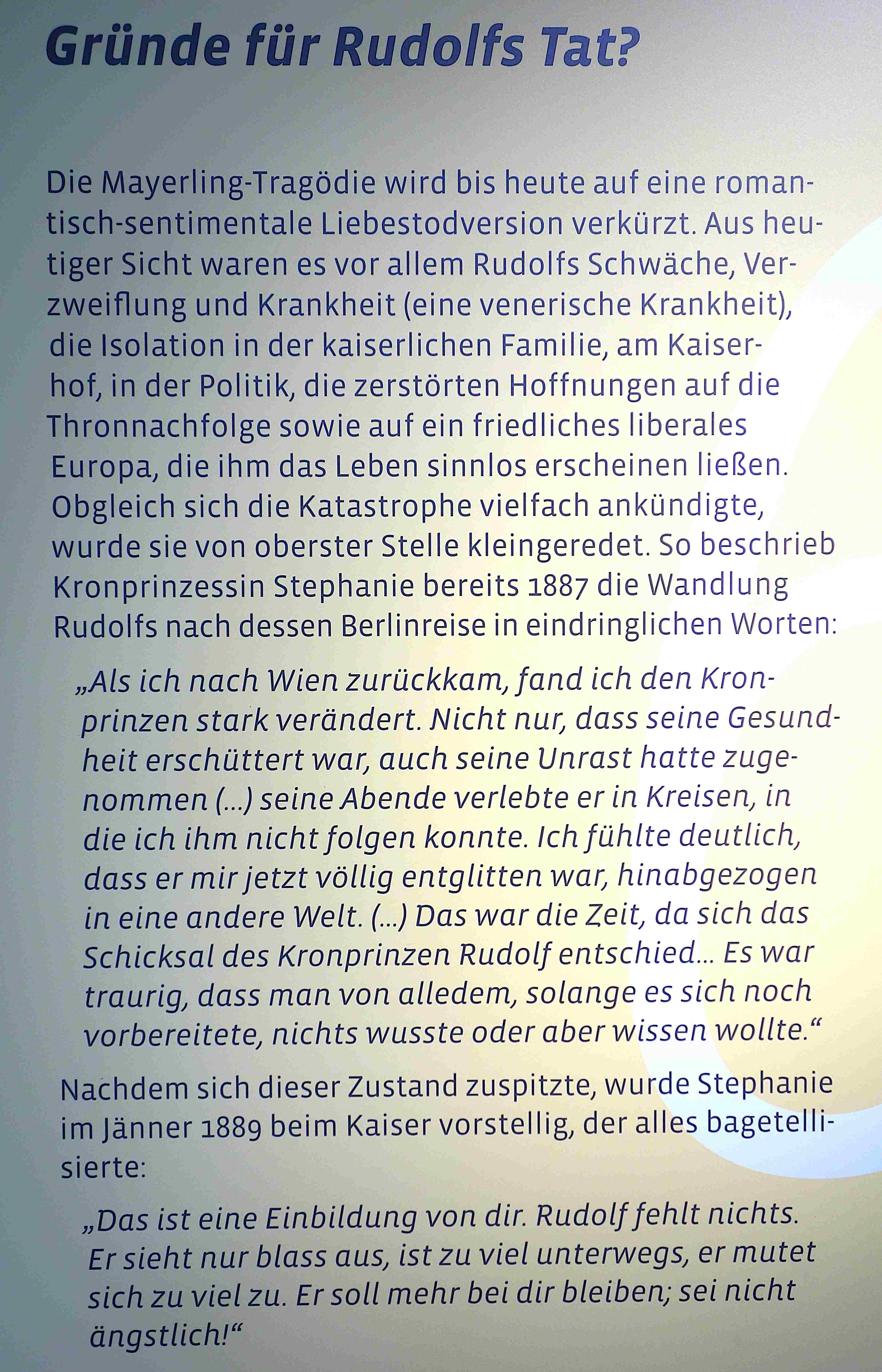 Abb.: Mögliche medizinische u.a. Gründe für Rudolfs Selbstmord. Quelle: Schautafel im Besucherzentrum/Museum Mayerling (2025). Foto: T.L. Zum Vergrößern bitte anklicken.