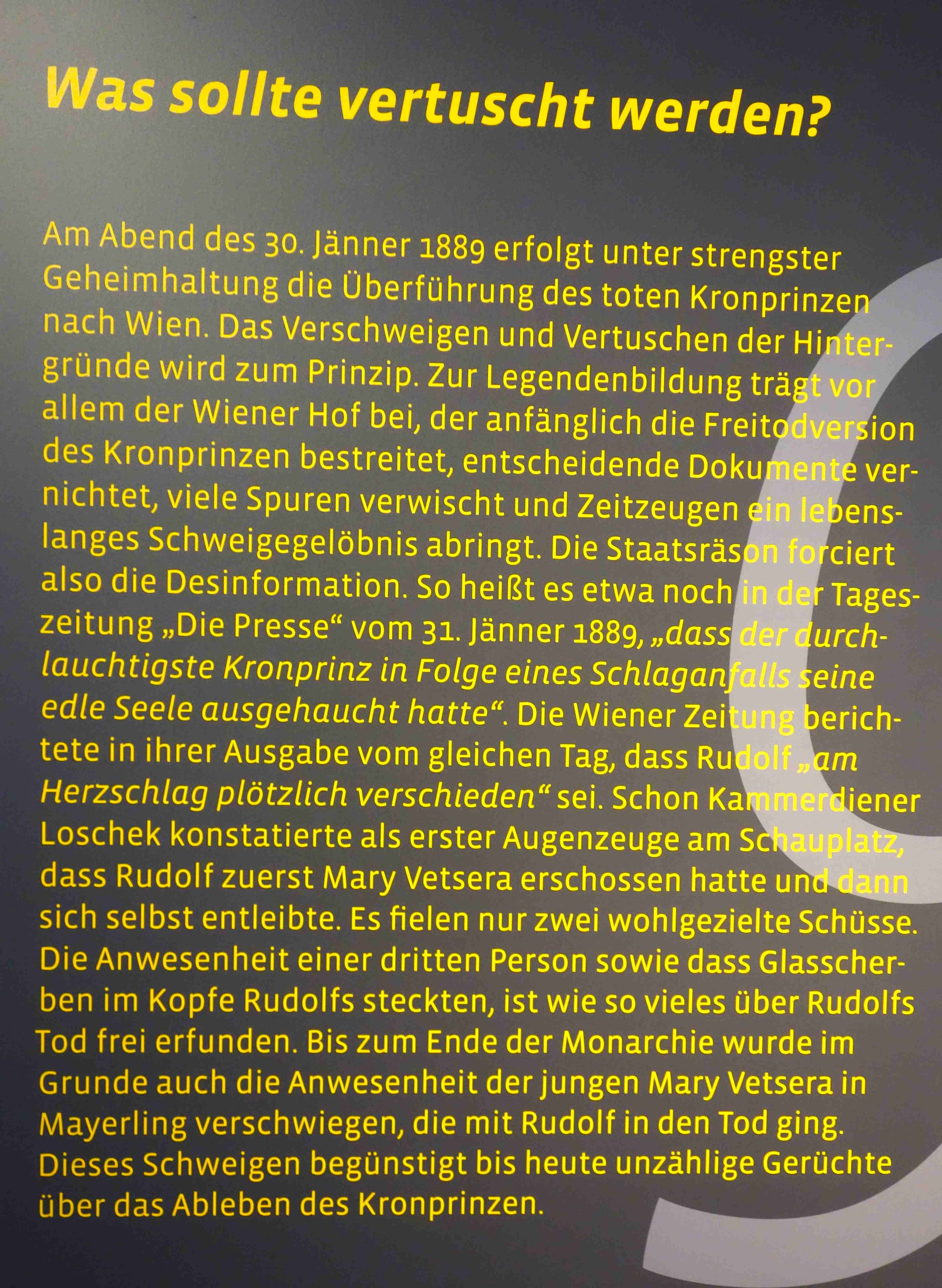 Abb.: Vertuschung des Vorfalles und Desinformation finden Eingang in die damaligen aktuellen Medien. Quelle: Schautafel im Besucherzentrum/Museum Mayerling. Foto: T.L.